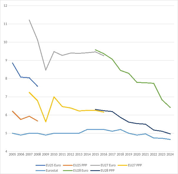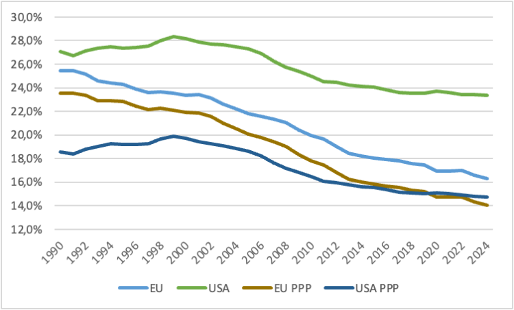 Europe’s more relevant success is the cohesive growth within the Union over the last decade, despite several dramatic shocks — the migration crisis in 2015, Covid in 2020, and the Ukraine war since 2022. This development, already visible in 2024, has continued, as Figure 2 shows. EU-wide inequality has declined further. It is measured here as the ratio of the incomes of the richest 20 per cent of the EU population to those of the poorest fifth, usually called the S80/20 ratio. Once again, a feature of international income comparisons that also shaped the EU–US comparison comes into play: the impact of how incomes are measured. Income disparities in the EU, too, are much lower when measured at purchasing power parity (the middle curve in Figure 2) than when measured nominally in euros (the top curve in Figure 2).