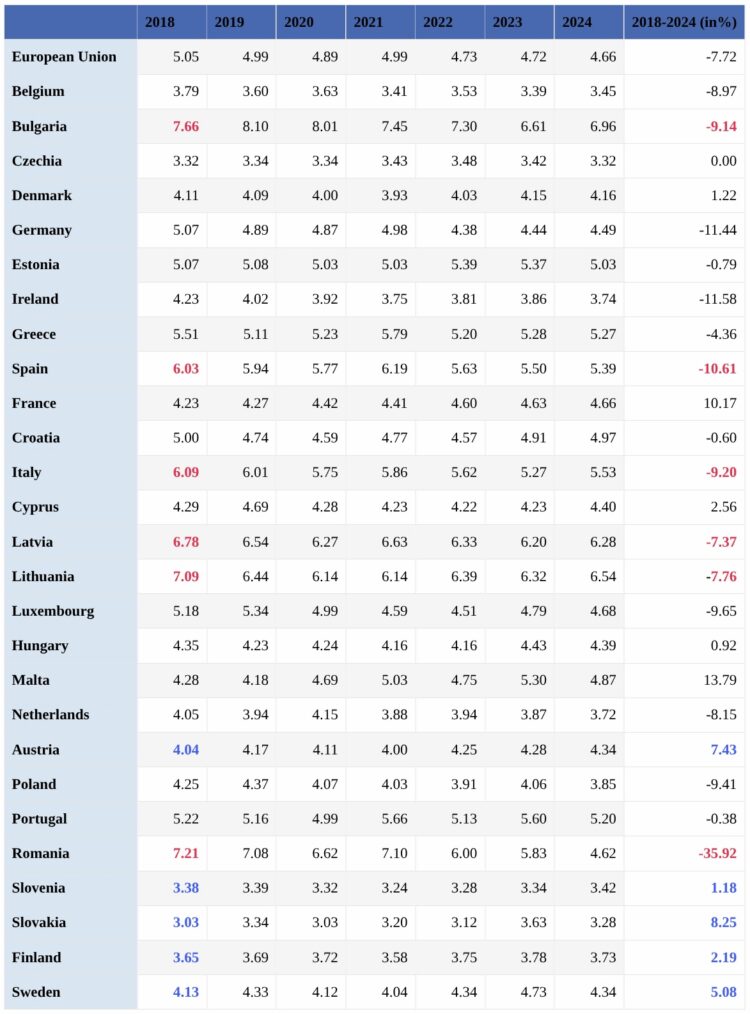 At a time when many people complain about rising inequality, it might be surprising that the official statistics show a different picture (see Table 1). Two reasons could explain this inconsistency. First, most complaints refer to the distribution of wealth, whose inequality has indeed increased. Second, there is large variation between countries. While some strongly reduced inequality, others hardly changed or even became more unequal. Tellingly, many countries that were particularly unequal in 2018 — such as Romania, Bulgaria, the Baltic states, Italy, and Spain (with values above 6, highlighted in red in Table 1) — reduced their inequality substantially. Conversely, some traditionally egalitarian countries became less so, among them Austria, France, Denmark, Finland, Sweden, Slovakia, and Slovenia (highlighted in blue in Table 1).