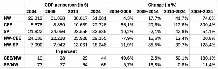 The primary driver of the decline in EU-wide inequality has been the relatively strong growth of Central and Eastern Europe. Table 2 compares the growth of per capita income across three regions of the EU: the rich northwest (NW), Central and Eastern Europe (CEE), and the southern periphery (SP) — comprising Portugal, Spain, Italy, Greece, Malta, and Cyprus. As the last column shows, Central and Eastern Europe’s average GDP per person increased by about 300 per cent, reaching 44 per cent of the level of the rich northwest in 2024, compared with 19 per cent in 2004. In contrast, the Mediterranean countries, which started in 2004 with a GDP per person amounting to 73 per cent of the rich northwest, only improved their position until 2009 and then lost those gains in the financial crisis and the subsequent sovereign-debt panic, with its harmful austerity policies. The period from 2009 to 2014 was a lost half-decade. Yet this strong relative improvement masks a rise in absolute disparities. As the data in the rows labelled NW–CEE and NW–SP show, the gap between incomes per capita increased despite the stronger growth — except before 2009.