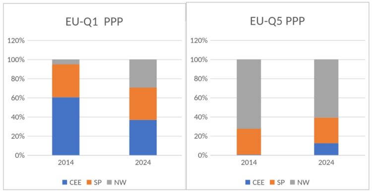 While in 2014 only 5 per cent of the people forming the poorest EU quintile came from the rich northwest, by 2024 the corresponding share was almost 30 per cent. It was people from Central and Eastern Europe who escaped from the bottom fifth of the EU income pyramid, while the share of the south remained virtually constant. For the richest fifth, the picture mirrors that development. In 2014, only the richest Slovenian quintile (0.5 per cent) made it into the top EU quintile. By 2024, Central and Eastern Europe’s share of the richest fifth had risen to about 12 per cent — again at the “expense” of the rich northwest and with a stable share from the south.