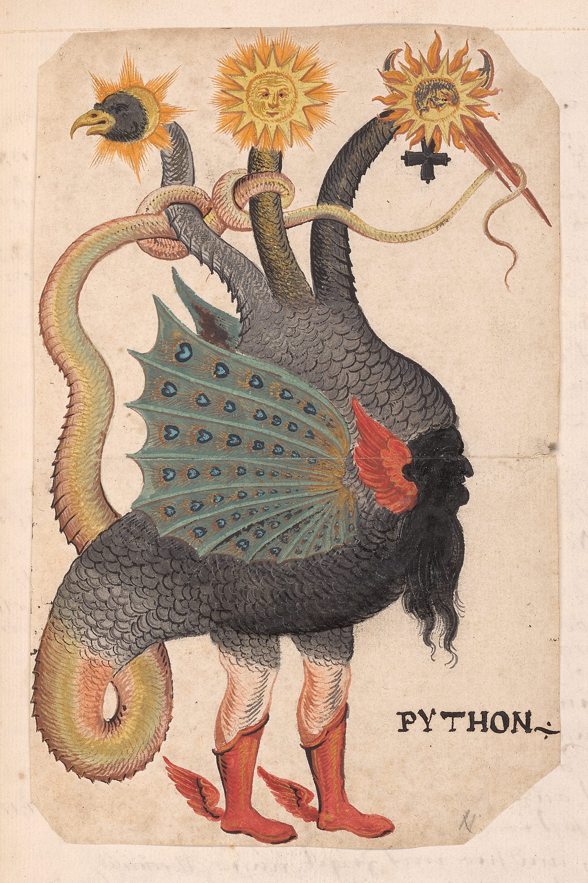 Another three-headed dragon, from a German manuscript of 1738, makes an appearance in Ball’s book. It has a sulphur head and a mercury head, but its third signifies ‘salt’, a category that encompassed a broad variety of compounds, as it does in modern chemistry. It was introduced into alchemy by perhaps the most famous alchemist of the Renaissance, Philippus Aureolus Theophrastus Bombastus von Hohenheim, better known as Paracelsus. He believed that these three ingredients determined the form not only of all metals, but of all matter, including plants and animals. The proportions of sulphur and mercury in a substance determined its combustibility and liquidity, whereas the amount of salt decided its solidity.