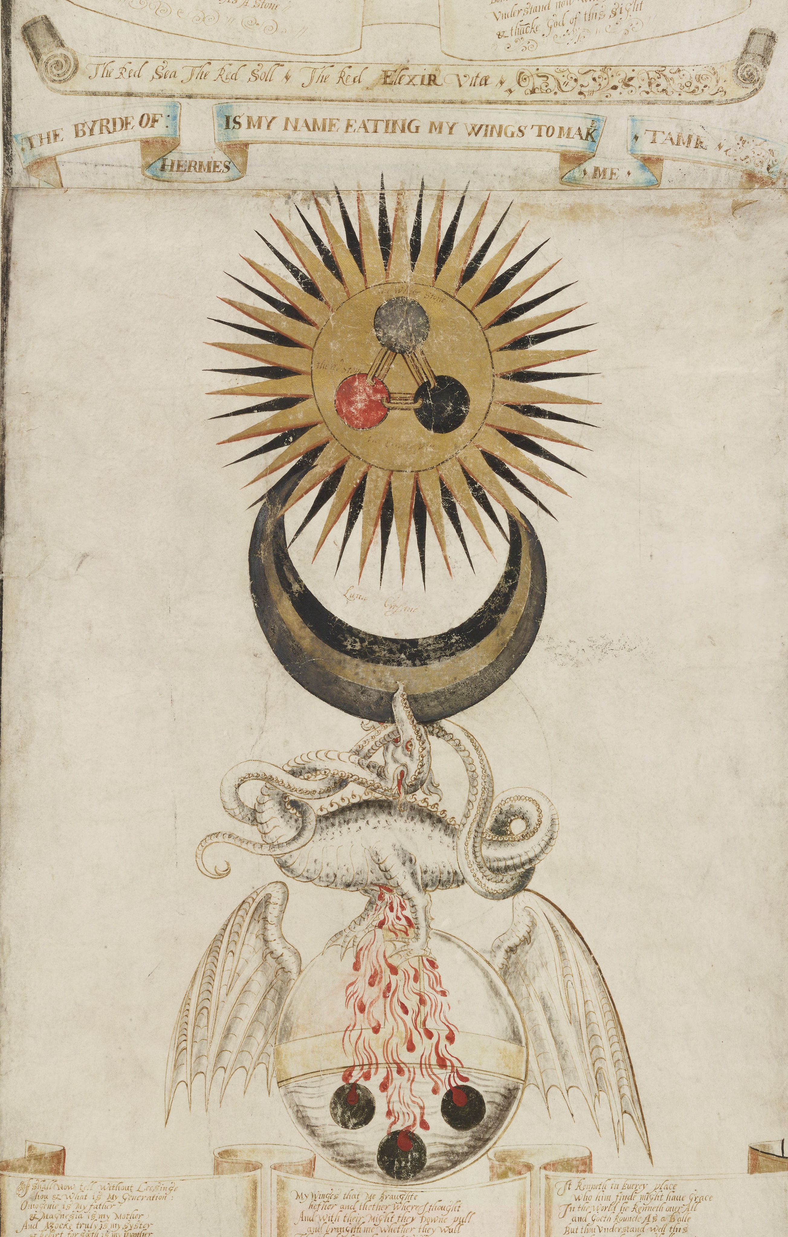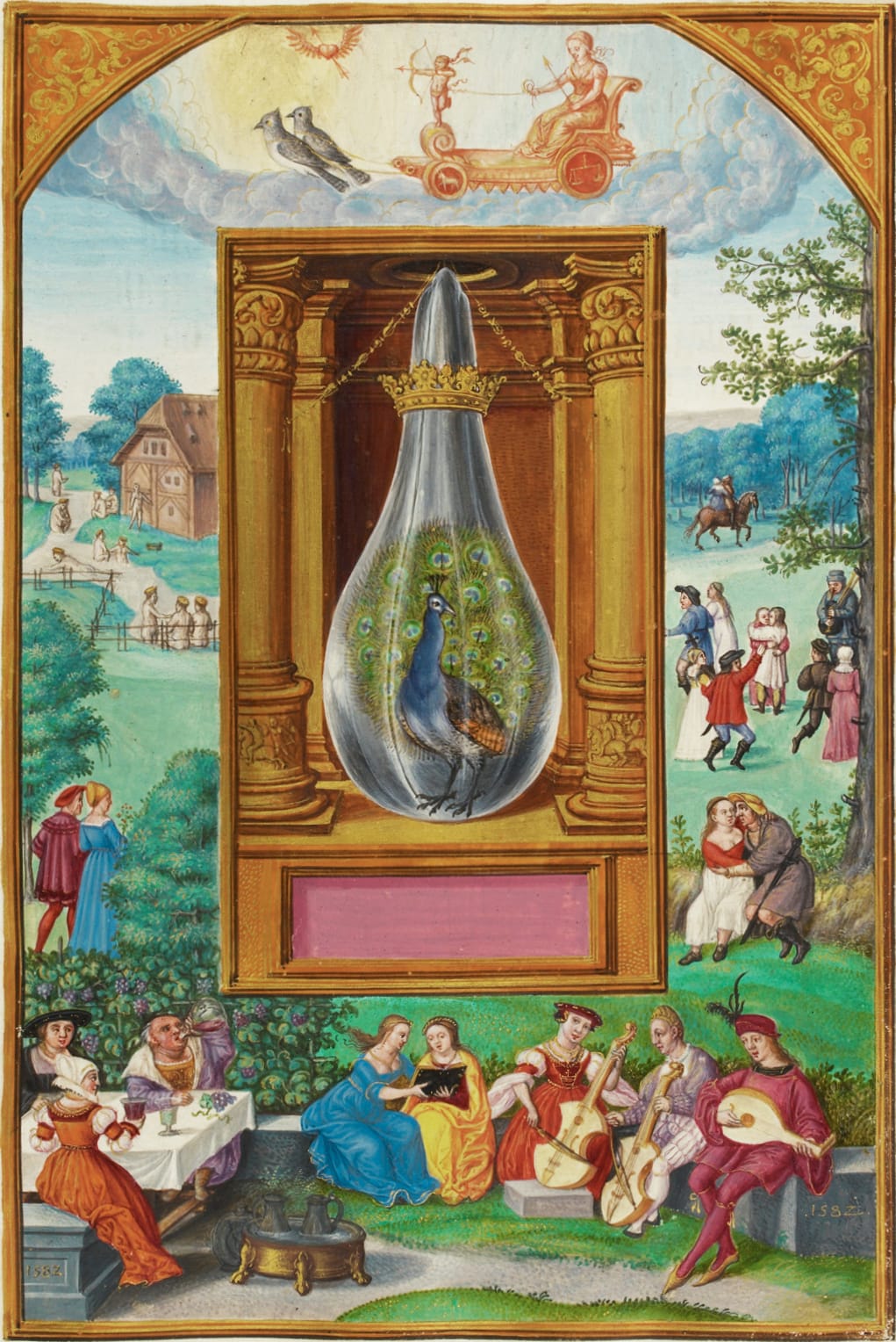 It’s unclear whether spiritual alchemy was any more successful in purifying the spirit than lab alchemy was in fabricating gold, but in pursuit of its goal, alchemy – both alchemies – deposited real treasure. The greatest books of alchemy contain exquisite illustrations alongside gnomic writing that, in its opacity and richness of imagery, resembles a kind of proto-Symbolism. Ball includes plates from one of the most celebrated books, Atalanta Fugiens, composed in 1617 by the German alchemist Michael Maier. An engraving entitled Nutrix ejus terra est (‘the Earth is its nurse,’ a line from the Emerald Tablet) depicts the Earth as a woman with the globe as her body, nursing a child, while at her feet a she-wolf suckles Romulus and Remus, and baby Jupiter is suckled by the goat Amalthea. On the opposite page, Maier has printed the tune and lyrics to a hymn of his own composition, which declares the nurse of the wise man, the source of his wisdom, to be the Earth herself. Another dazzling alchemical text, the Ripley Scroll – of which there are several known versions dating from the early 16th century to the mid-17th century, some of them twenty feet long – prints The Compound of Alchemy alongside ornate, symbolic imagery. A section on the ‘Red Sea’, for example, represents ‘mercurial water’ as menstrual blood raining from the body of a dragon with a crescent moon between her jaws. Perhaps the most beautiful alchemical book of all, not mentioned by Ball, is the Splendor Solis, an illuminated manuscript from the 16th century illustrating a text attributed to Salomin Trismosin, a teacher of Paracelsus. Many of the brilliantly coloured images from this work are representations of specific alchemical processes, in which a large glass flask containing symbolic creatures appears at the centre of the page, while outside the flask, detailed scenes from life play out under astrological portents. One page shows the flask with a peacock inside. Above the flask, Venus appears in her chariot pulled by turtle doves, while below, people make merry: a band plays music, a group sits at a table drinking wine, lovers embrace or stroll on the grass.