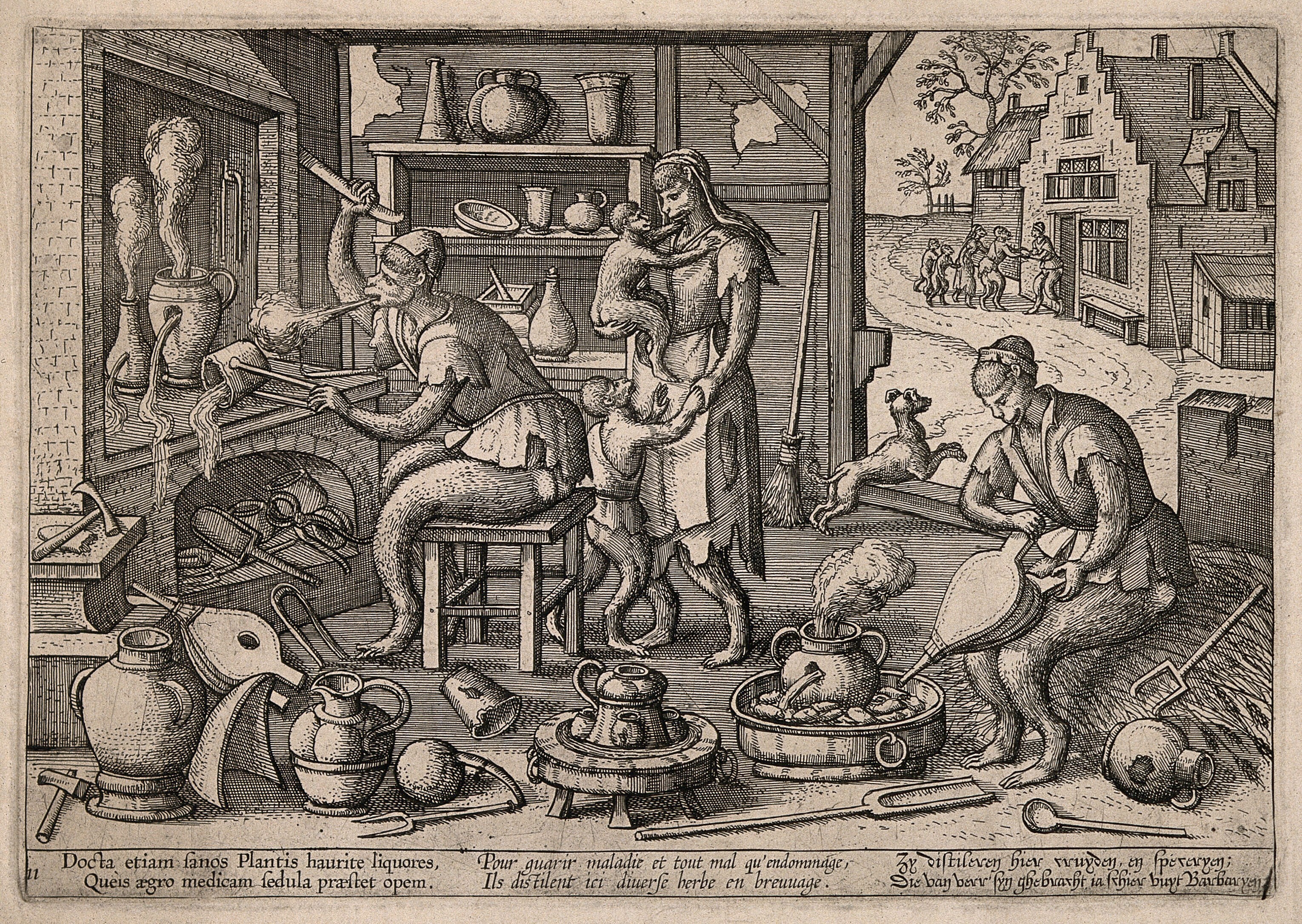 A picture of the alchemist’s laboratory from a hundred years earlier – a satirical woodcut by Pieter van der Borcht – depicts the alchemist, his wife and children as apes, surrounded by broken equipment, hopelessly puffing on the coals of their furnaces. In the background, another ape family can be seen at the door of the poorhouse accepting a parcel of food. At a time when alchemy was supposedly in its heyday, the print offers a popular view of the alchemist as a deluded fool, absorbed in his quest for the philosopher’s stone while he and his family sink into poverty. The philosopher’s stone, a mythical substance that could transmute any metal into gold, was the alchemist’s main preoccupation for hundreds of years. In that time, though the stone remained elusive, the alchemical laboratory produced many useful things, including dyes, medicines and porcelain. The recipe for porcelain, which had been imported from China, remained a mystery in Europe until an alchemist at the court of Augustus II, King of Poland, discovered it by accident in 1704 when his clay crucible (containing kaolinite) was transformed by intense heat into white ceramic. In 1669, phosphorus was isolated by a German alchemist, Hennig Brand, who distilled large volumes of urine, believing it to contain the crucial agent of transmutation, until he was left with a soft metallic substance that glowed, ignited in air and gave off a garlicky odour.