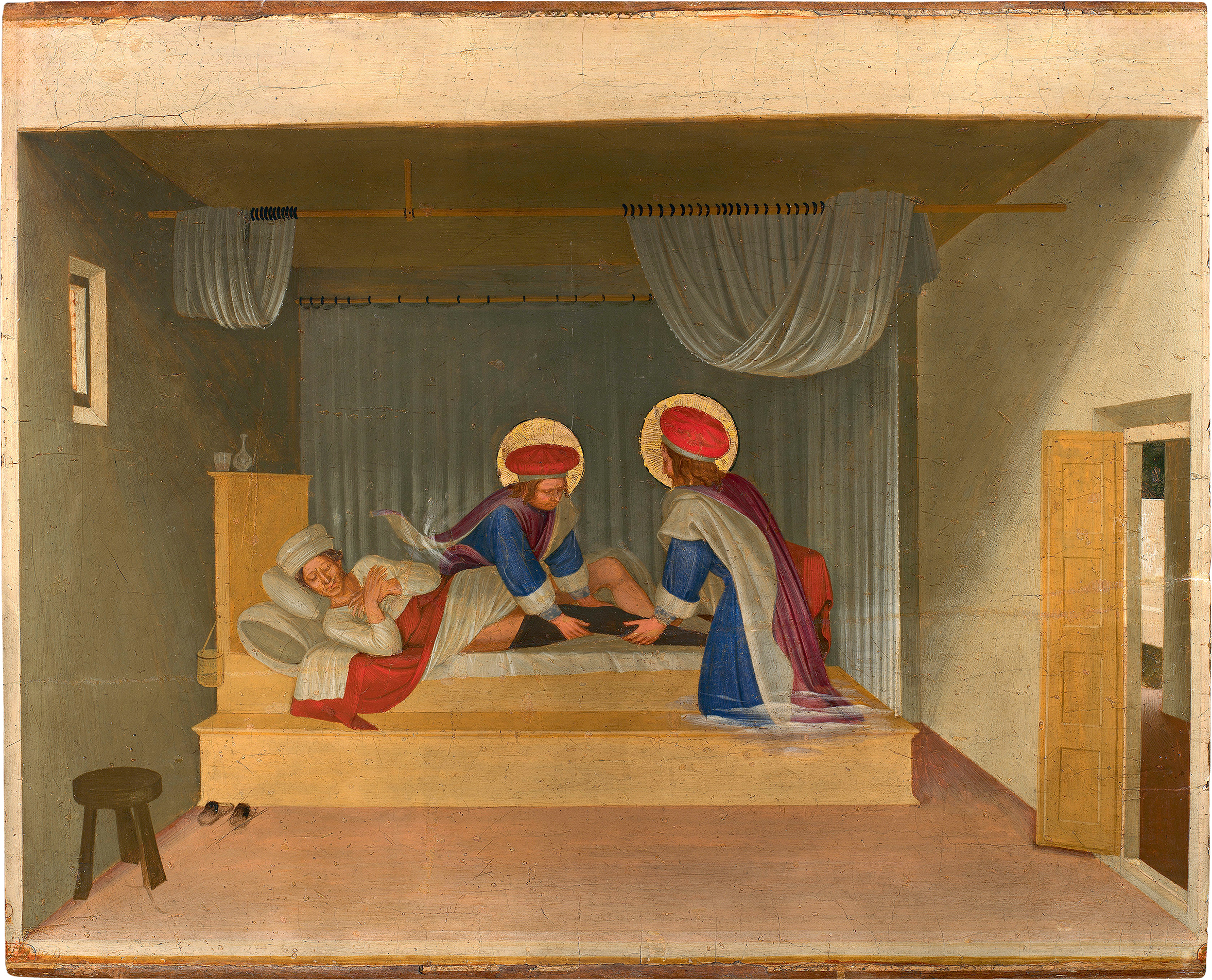 The predella scenes – their sequence now confirmed through wood-grain analysis – narrate the life, martyrdom and afterlife of Cosmas and Damian (in addition to a central panel which depicts Christ’s entombment). As Christian doctors, the brothers devoted themselves to healing the sick at no cost, but in the first scene, Damian violates this principle by accepting three eggs as payment from a grateful patient. In the subsequent scenes, the brothers endure a series of torments as punishment for their Christian proselytising – drowning, burning at the stake, crucifixion – before finally being beheaded. In the penultimate scene, depicting their burial, the repercussions of the egg incident emerge: Cosmas, aggrieved by Damian’s flouting of their principles, requested that he be laid to rest separately from his brother. Yet at the burial, a camel miraculously speaks: a curling banner of text unfurling from its mouth declares that the brothers belong side by side in death. The final scene depicts one of the brothers’ posthumous miracles: the bizarre Miracle of the Black Leg, in which a deacon with a diseased leg receives a transplant from Cosmas and Damian, who appear to him in a dream. However, they use the leg of a recently deceased man from Ethiopia, leaving the deacon with a mismatched limb. Each scene of the predella is a discrete miniature world, a carefully wrought space alive with drama and anecdotal detail, while the series as a whole is bound by a quiet coherence of scale, colour and light.
