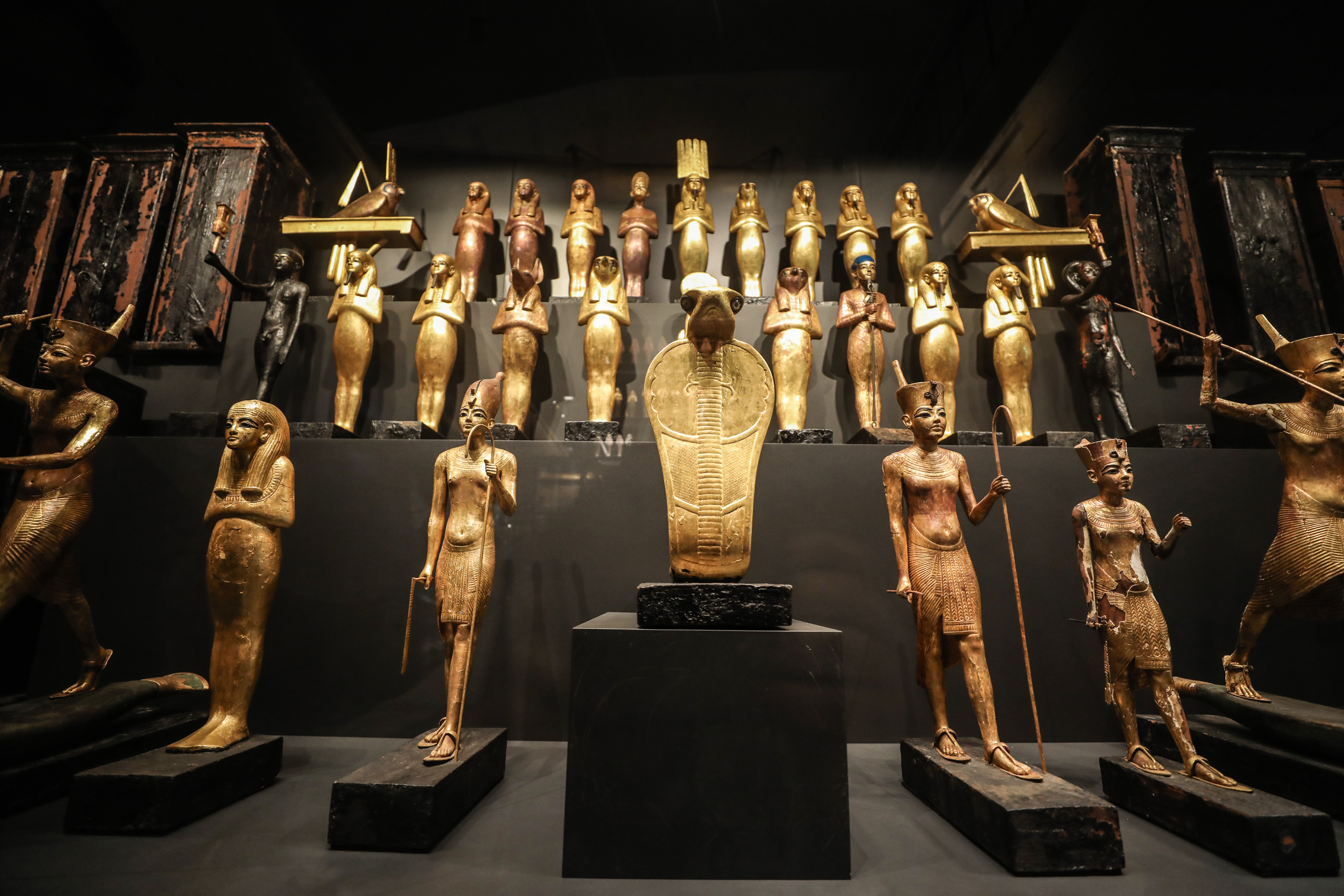 The pyramids provide the Egyptian state with a monumental symbol of national power (in contrast to the Beaux-Arts neighbourhood surrounding the old museum) yet the displays have little to say about Giza. Most of the star objects found at the site, such as the schist triads of Menkaure or the statue of an enthroned Khafre protected by the Horus falcon, remain in central Cairo. The funerary furnishings of Queen Hetepheres, mother of Khufu, the king buried in the Great Pyramid, are the only part of the display focused on Giza itself. In the Egyptian Museum they were shown in a low, cramped space; Hetepheres’ ceremonial canopy, gilded bed and throne make much more of an impression here.