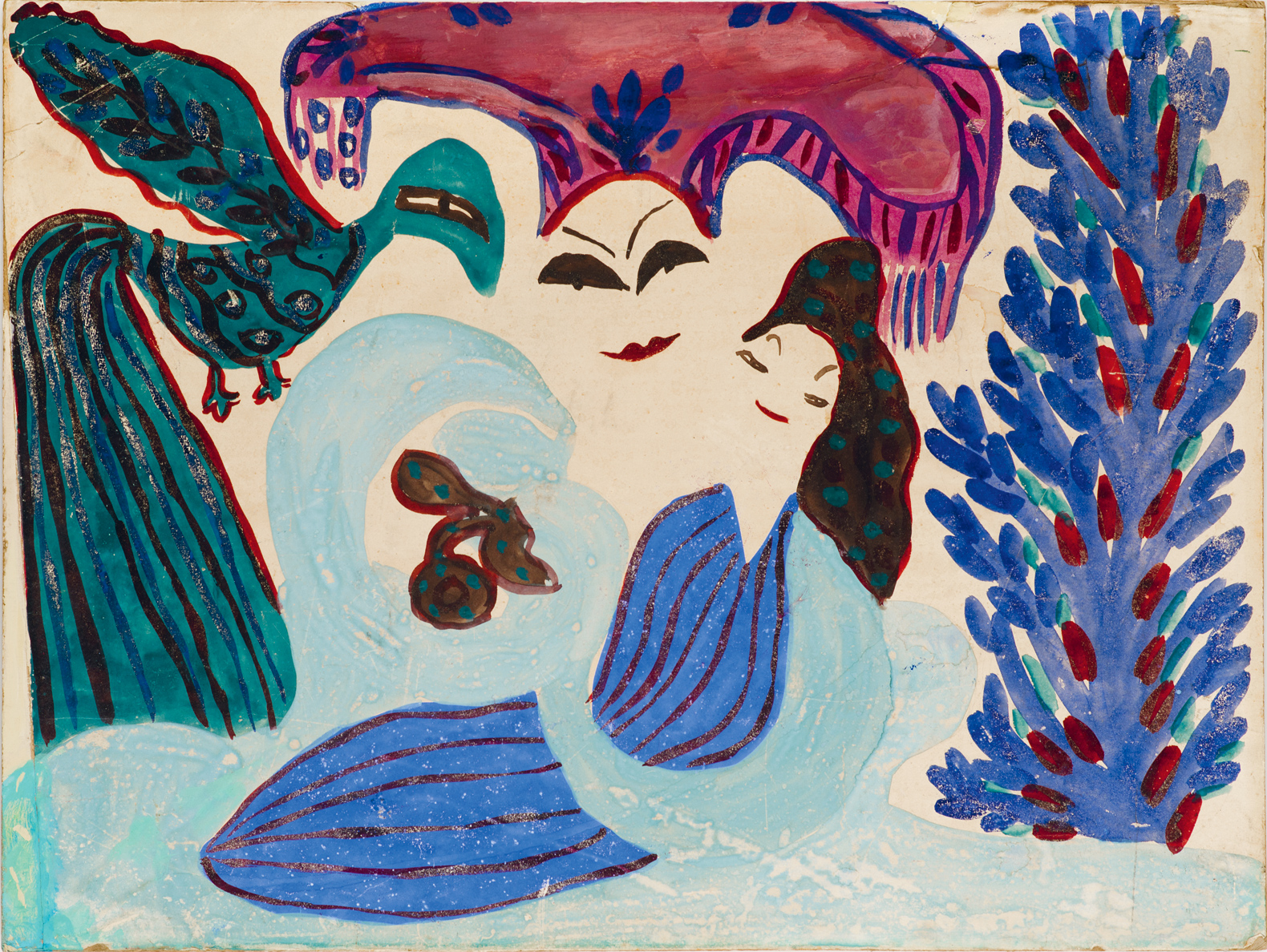 From a European perspective, this is a story of explosive celebrity and subsequent disappearance. Baya’s gouaches and sculptures were exhibited in Paris when she was sixteen. She modelled in clay alongside Picasso at the Vallauris pottery studios: they ate couscous together; he called her ‘la Berbère’. In North Africa she has been a constant presence. In 1969, her work appeared on Algerian postage stamps. At the Vieille Charité, the former alms-house in Marseille where her work was exhibited in 2023 with a sumptuous catalogue, the Algerian attendant took her importance for granted: he had grown up with her paintings. That exhibition was also seen in Paris. Yet there has never been a major UK exhibition dedicated to her work. We have been missing a glory.